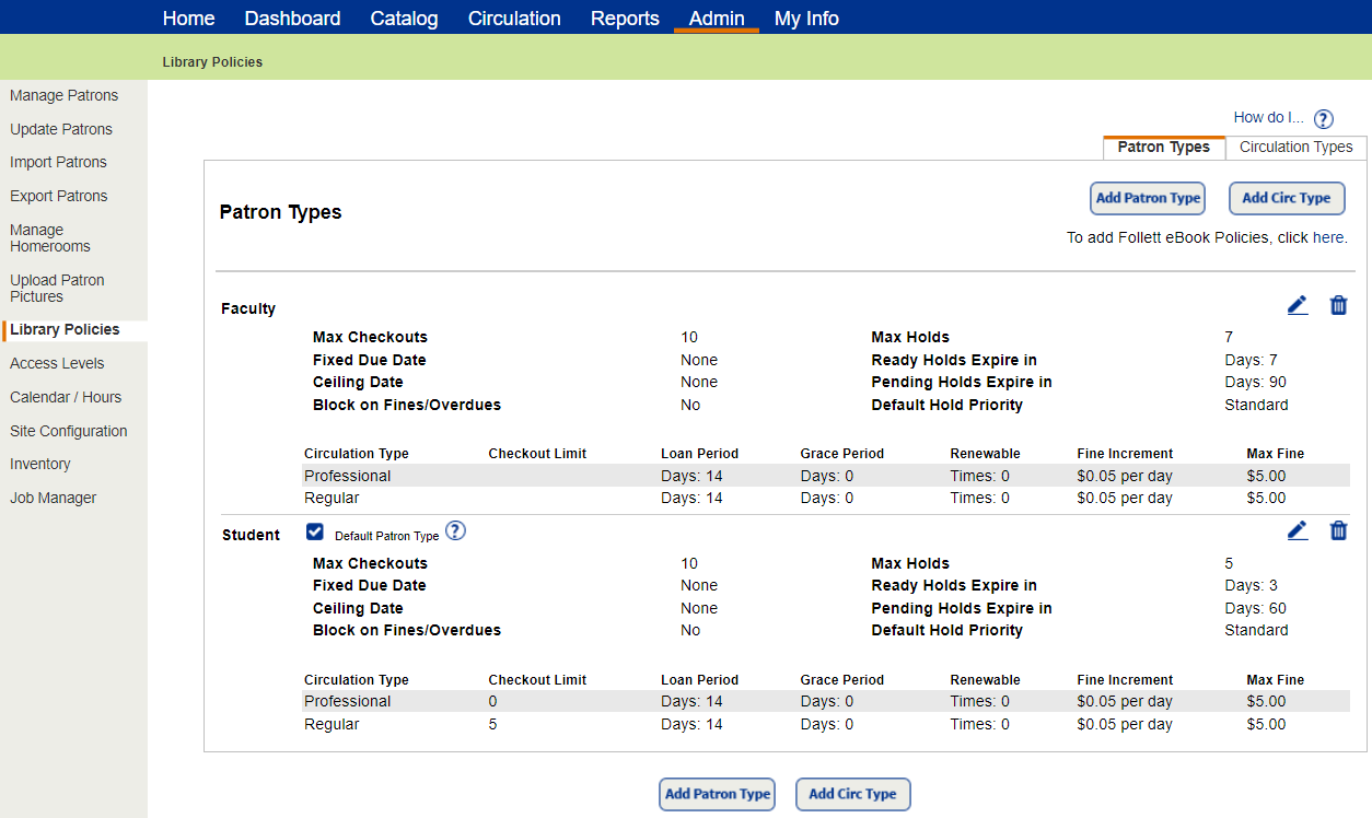 Destiny is installed with two Patron Types (Faculty and Student) and one Circulation Type (Regular). You can edit existing Patron and Circulation Types, as well as add new ones from the Library Policies page.